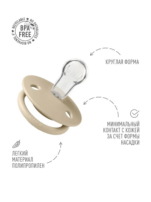 Классический круглый сосок пустышки BIBS De Lux по форме и размеру напоминает сосок матери, благодаря чему она идеально подходит малышам с рождения.