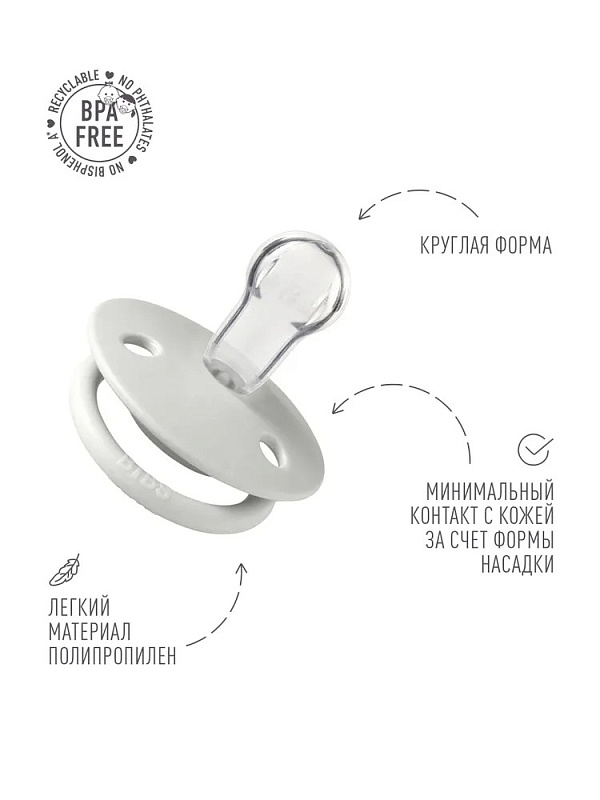 Пустышки BIBS изготавливаются из экологичных, на 100% безопасных материалов. Сосок у пустышки сделан из гипоаллергенного силикона без запаха и вкуса. Силиконовая пустышка обладает высокой прочностью и хорошо массирует дёсны во время прорезывания зубов. Защитная накладка (шилдик) сделана из полипропилена. Изогнутая форма накладки с тремя круглыми отверстиями минимизирует контакт с чувствительной и нежной кожей вокруг рта ребенка.