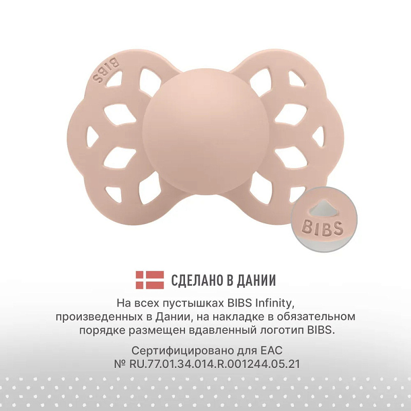 Пустышки BIBS изготавливаются из экологичных, на 100% безопасных материалов. Сосок выполнен из гипоаллергенного силикона без запаха и вкуса, а накладка (шилдик) — из полипропилена. Силиконовая пустышка обладает высокой прочностью и хорошо массирует дёсны во время прорезывания зубов. Дизайн накладки продуман таким образом, чтобы минимизировать контакт с чувствительной и нежной кожей вокруг рта ребенка.
