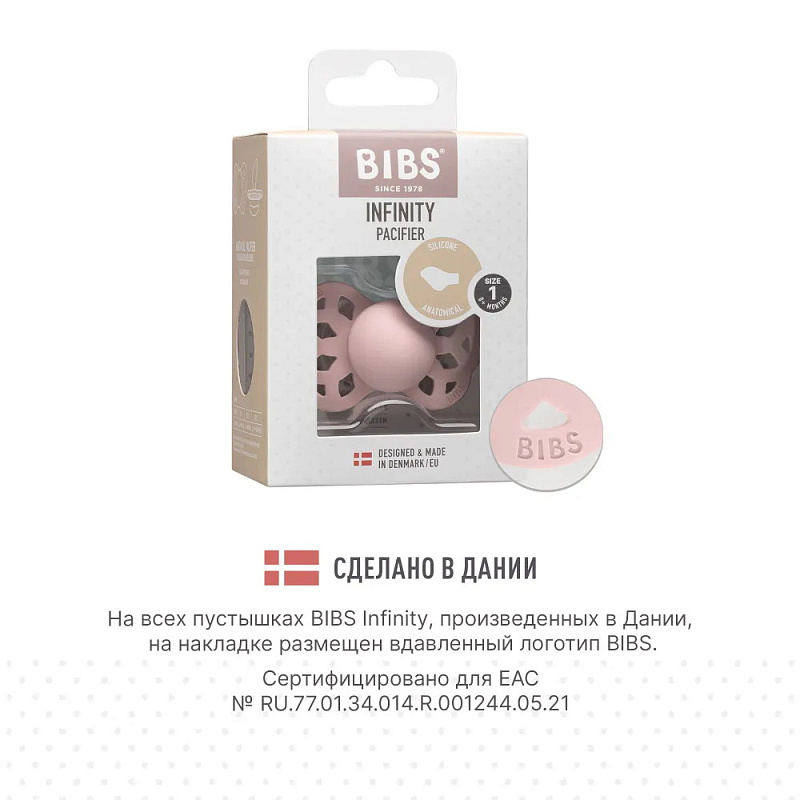 Пустышки BIBS изготавливаются из экологичных, на 100% безопасных материалов. Сосок выполнен из гипоаллергенного силикона без запаха и вкуса, а накладка (шилдик) — из полипропилена. Силиконовая пустышка обладает высокой прочностью и хорошо массирует дёсны во время прорезывания зубов. Дизайн накладки продуман таким образом, чтобы минимизировать контакт с чувствительной и нежной кожей вокруг рта ребенка.