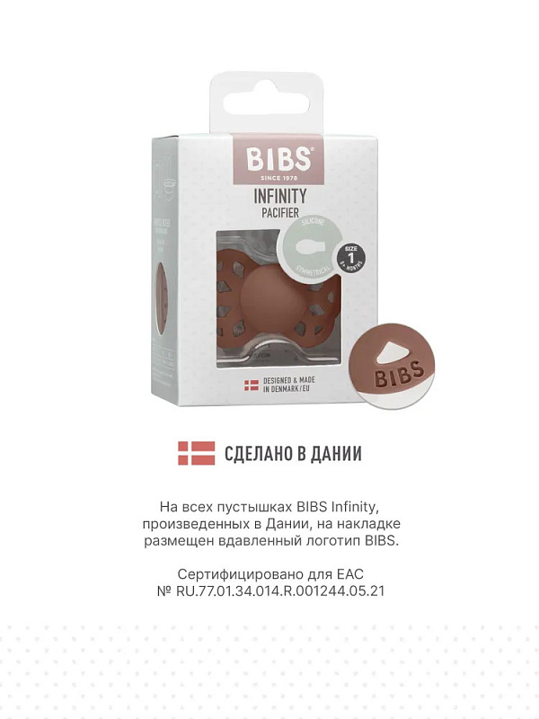 Пустышки BIBS изготавливаются из экологичных, на 100% безопасных материалов. Сосок выполнен из гипоаллергенного силикона без запаха и вкуса, а накладка (шилдик) — из полипропилена. Силиконовая пустышка обладает высокой прочностью и хорошо массирует дёсны во время прорезывания зубов. Дизайн накладки продуман таким образом, чтобы минимизировать контакт с чувствительной и нежной кожей вокруг рта ребенка.