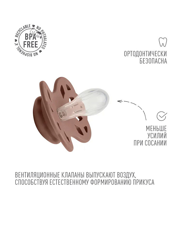 В каждой пустышке BIBS есть специальные вентиляционные клапаны, благодаря которым она является ортодонтически безопасной.