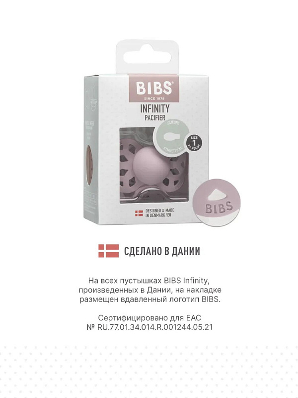 Пустышки BIBS изготавливаются из экологичных, на 100% безопасных материалов. Сосок выполнен из гипоаллергенного силикона без запаха и вкуса, а накладка (шилдик) — из полипропилена. Силиконовая пустышка обладает высокой прочностью и хорошо массирует дёсны во время прорезывания зубов. Дизайн накладки продуман таким образом, чтобы минимизировать контакт с чувствительной и нежной кожей вокруг рта ребенка.
