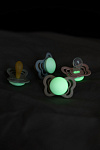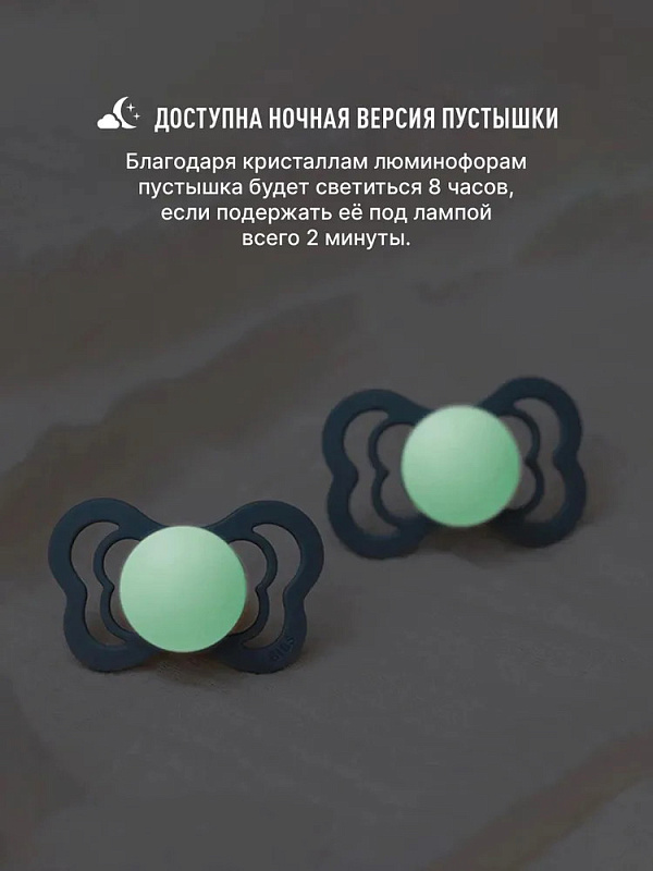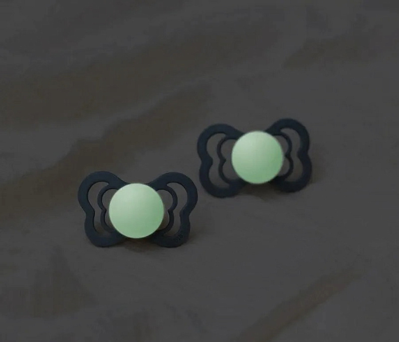 Накладка пустышки Supreme Glow излучает мягкий свет и её легко найти в тёмной комнате. Достаточно двух минут под лампой, чтобы «зарядить» пустышку. Свечение накладке придают кристаллы люминофоров.