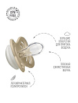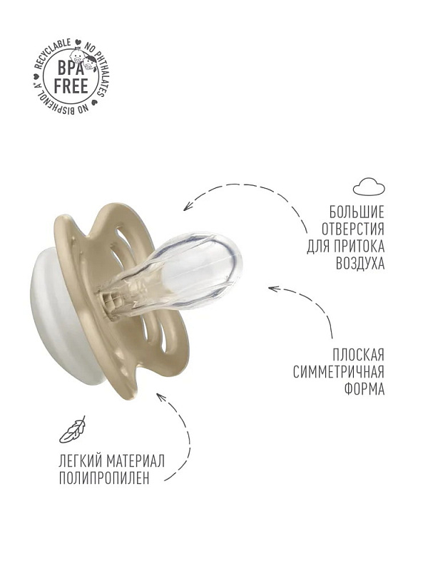 Пустышка Supreme имеет оригинальную фигурную накладку и сосок симметричной плоской каплевидной формы, который способствует правильному расположению языка и развитию челюстно-лицевых мышц малыша.
