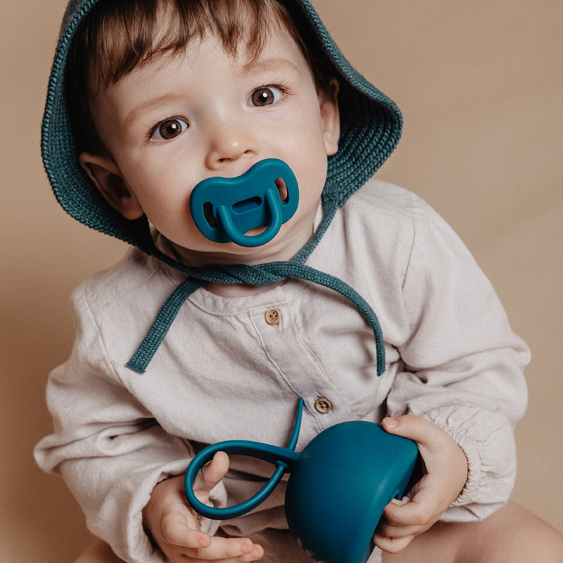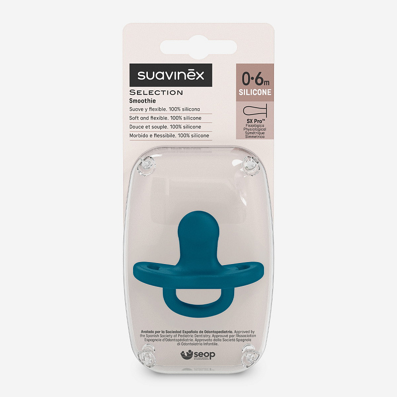 Физиологическая детская пустышка Suavinex Colour Essence SX PRO имеет особую конструкцию. Она располагается во рту ребенка таким образом, чтобы не препятствовать развитию естественного правильного прикуса. По бокам корпуса пустышки расположены вентиляционные отверстия, обеспечивающие хорошую циркуляцию воздуха. Это предотвращает раздражение нежной кожи малыша в области рта. Сверхмягкий силикон имитирует форму материнского соска, создавая у ребенка комфортные ощущения в процессе сосания. За счет пескоструйной обработки силикон надежно защищен от прилипания пыли и ворса.