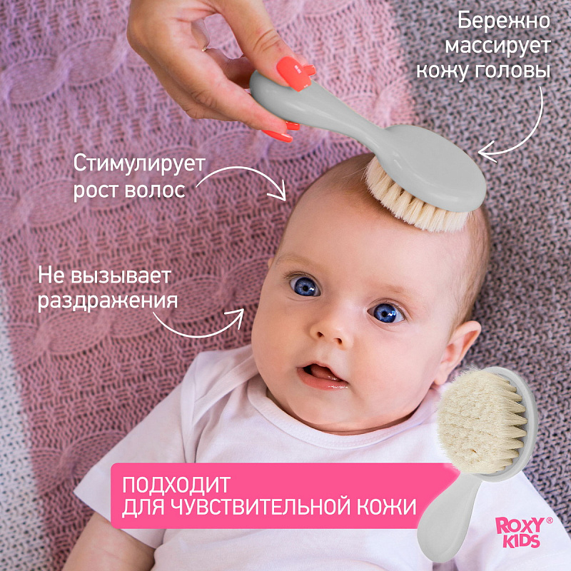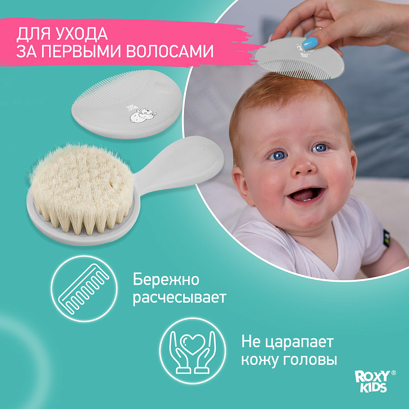 Расческа-щетка с мягким ворсом из натуральной овечьей шерсти и удобный гребешок ROXY-KIDS предназначены для малышей и новорожденных. Мягкая пушистая щетка имеет удобную эргономичную ручку, улучшает кровообращение кожи головы, не царапая её. Нежный массаж расслабляет и успокаивает перед сном, а стимуляция волосяных луковиц ускоряет рост первых волос малыша. Натуральная щетка из овчины позволит пригладить волосики и придать им аккуратный вид. А с помощью гребешка с частыми закругленными зубчиками удобно расчесывать запутавшиеся и скатавшиеся волосы. Набор для расчесывания ROXY-KIDS отличает приятный дизайн, прочность и экологичность материалов. Гребешок и расческа-щетка отлично дополняют друг друга, и в дальнейшем с их помощью вы сможете научить ребенка причесываться самостоятельно.
