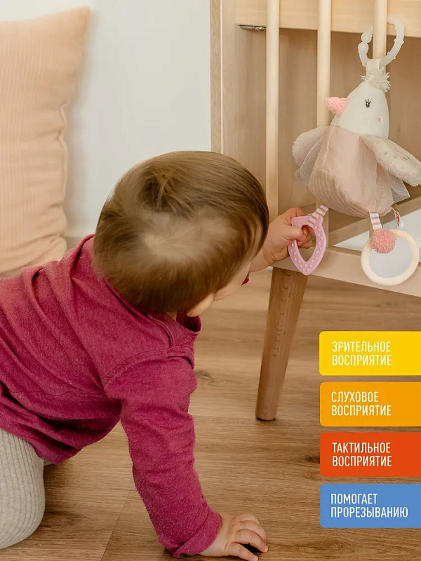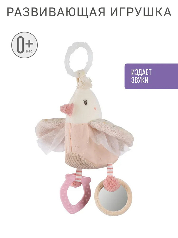 С этой птичкой весело играть дома или в дороге: благодаря практичному крепёжному кольцу игрушку можно прикрепить к коляске, автокреслу или к кроватке.