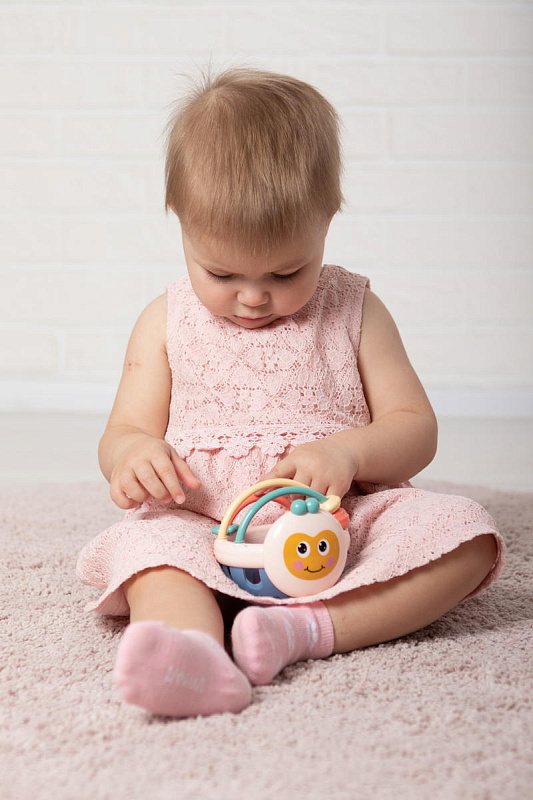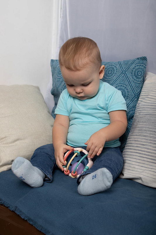 Специально разработанная форма для захвата игрушки маленькими ладошками. Мягкий силиконовый верх корпуса исключает травматичность, нет острых углов и мелких деталей. Игрушка развивает общую моторику, координацию движений, внимание, зрительные и слуховые функции. У погремушки приятный мелодичный звук. Нижняя часть погремушки имеет мягкую структуру, внутри которого находится шарик. Его интересно трогать и изучать малышу. Цветовая гамма подойдет и мальчикам и девочкам.