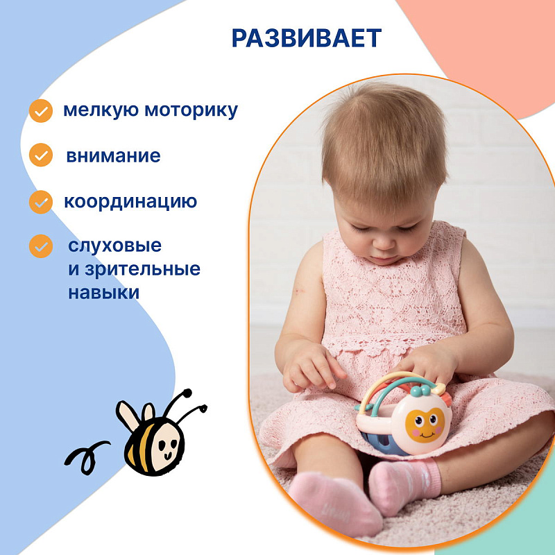 Погремушка «Пчелка» отличается прекрасным дизайном и высоким качеством применяемых для изготовления материалов. Легкая, эргономичная и хорошо помещается в маленькой ручке.