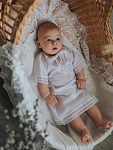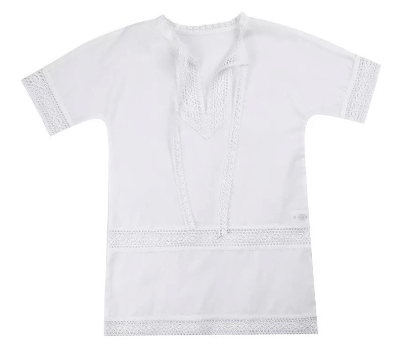 Роскошная крестильная рубашка выполнена из 100% нежнейшего хлопка. Оформлена красивым бежевым кружевом. Модель на завязках спереди для удобного одевания на малыша.