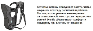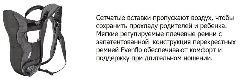 - регулируемые плечевые ремни с мягкой подкладкой и запатентованная конструкция перекрестных ремней Evenflo обеспечивают комфорт и поддержку, необходимые для длительного ношения