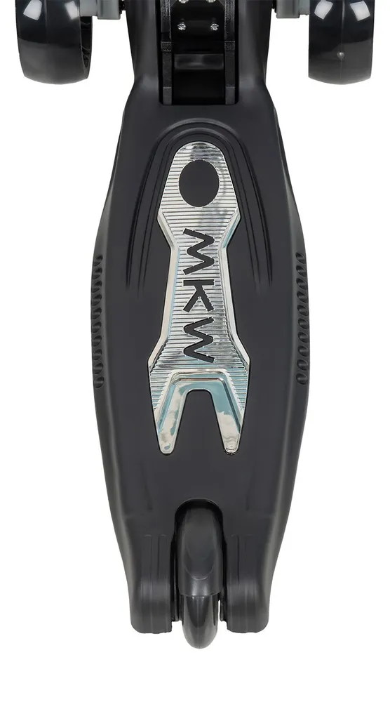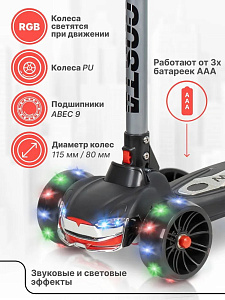 - Световые и звуковые эффекты: Самокат оснащен звуковыми и световыми эффектами, которые работают от 3 батареек ААА (в комплект не входят). Колеса светятся при движении, а подсветка деки добавляет яркости в вечернее время.