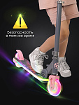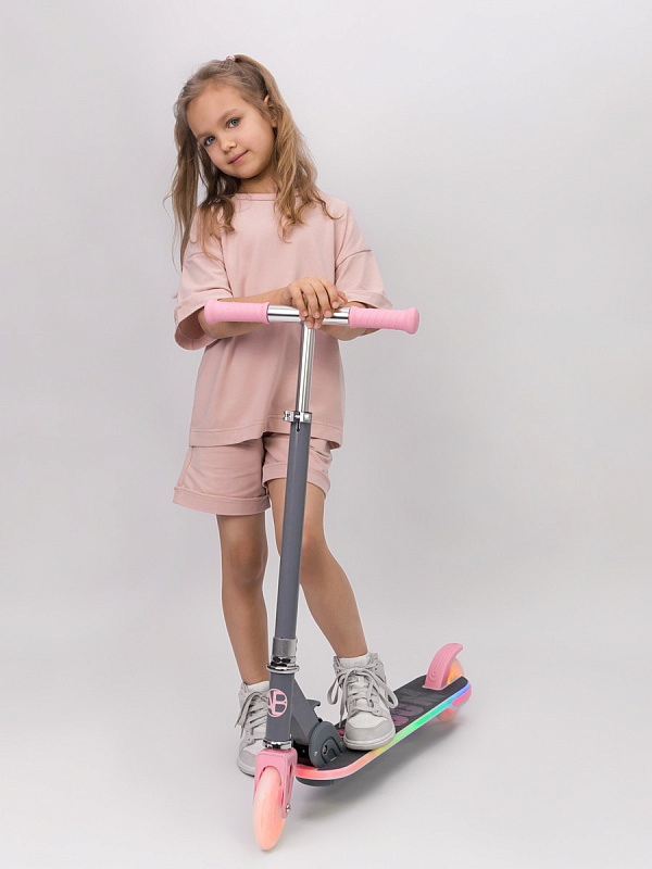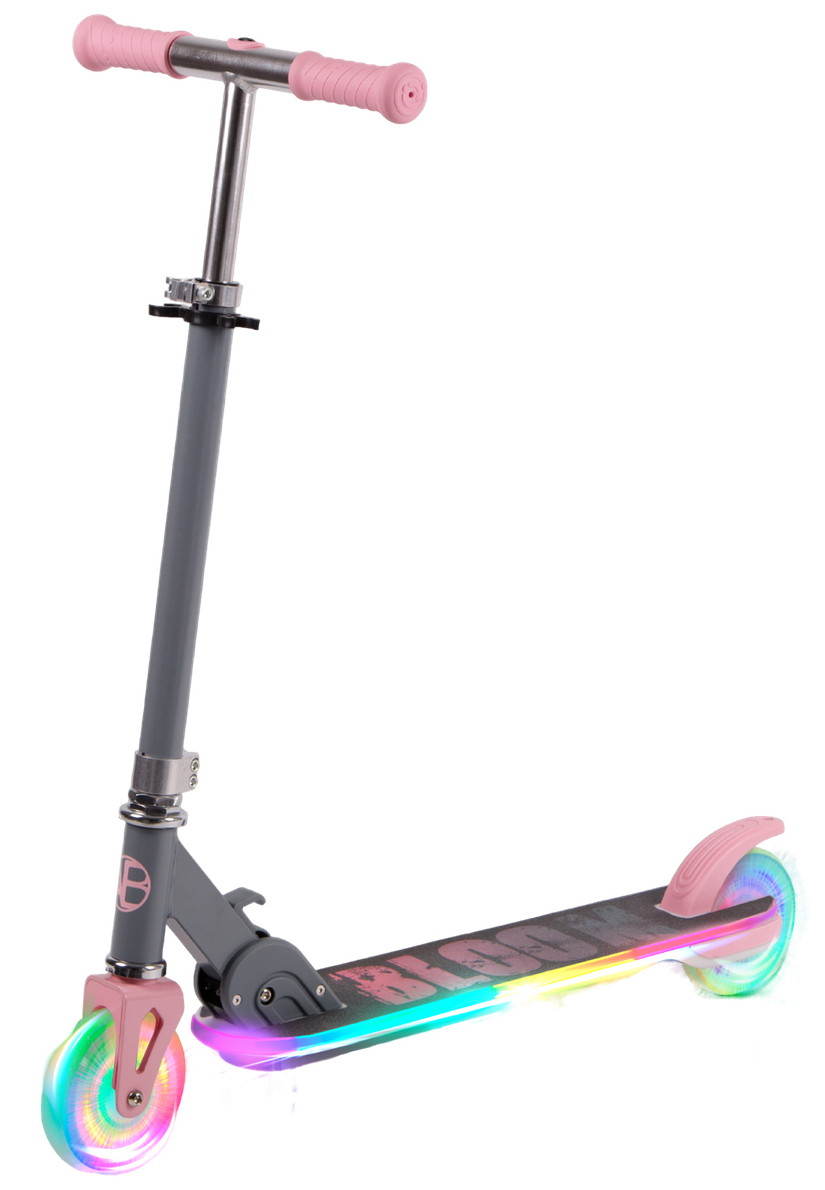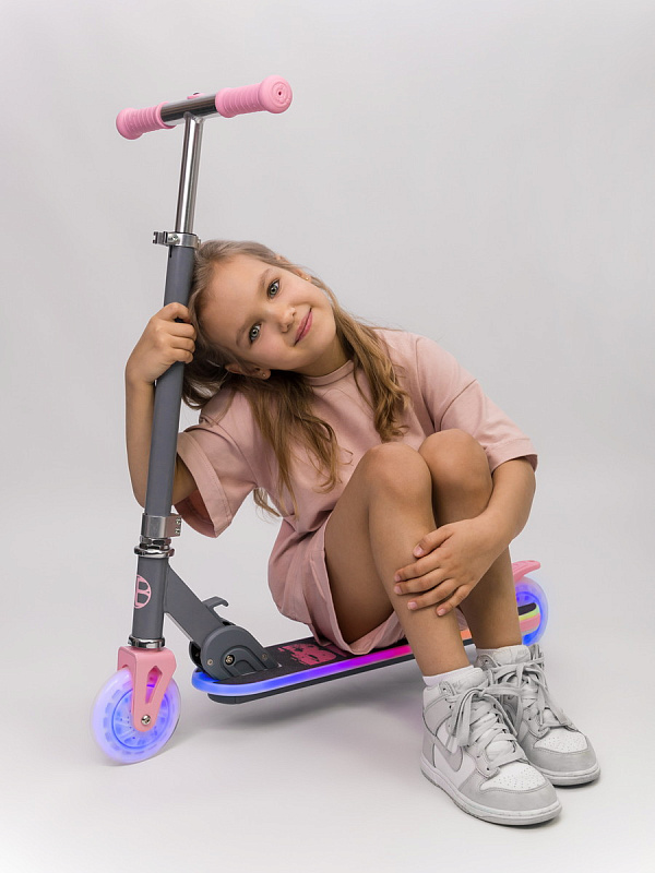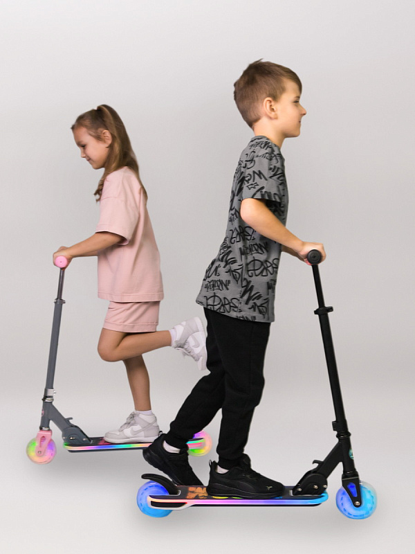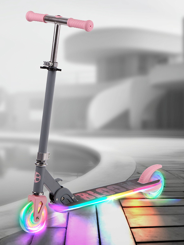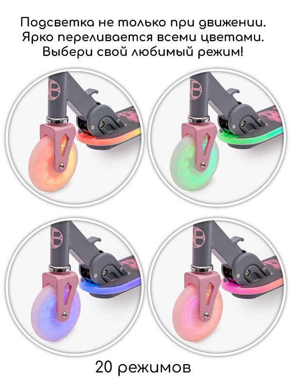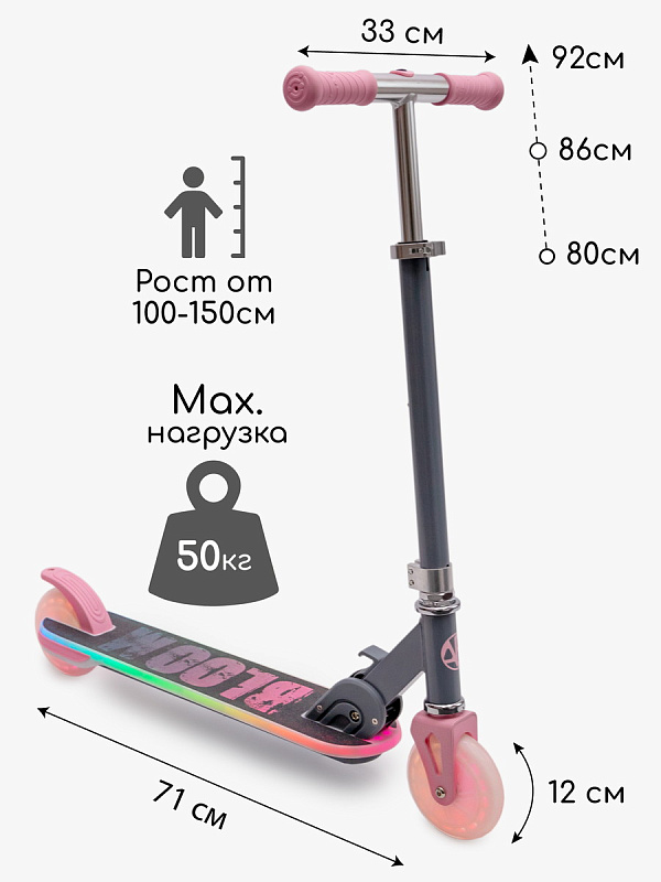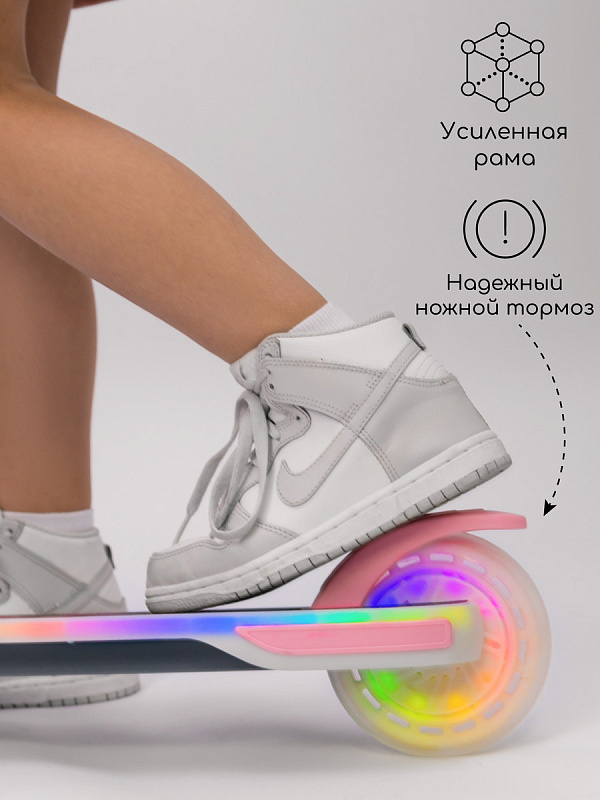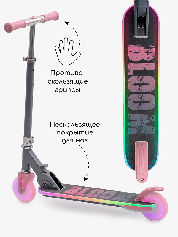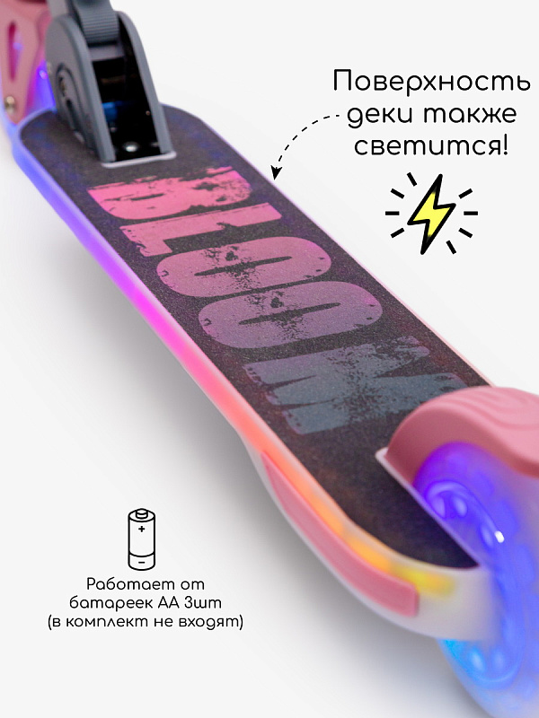 Самокат двухколесный с подсветкой для детей и подростков AmaroBaby Bloom. Идеально подойдет для прогулок и повседневных поездок в сад и школу. Рекомендуемый рост райдера 100-150 см и весом до 50 кг. Дека и колеса имеют встроенную подсветку из 20 режимов! Переключаются режимы с помощью кнопки управления, расположенной на руле. Питание от трех батареек АА 1,5V (в комплект не входят). Руль регулируется по высоте от 80 см до 92 см, благодаря чему самокат подойдет как для дошкольников, так и для подростков. Самокат детский оснащен усиленной рамой, обеспечивающей безопасность ребенка во время катания, и декой со специальным противоскользящим покрытием для большей устойчивости. Бесшумные полиуретановые колеса светятся не только во время езды-подсветка включается одновременно с подсветкой на деке. Диаметр колес 12 см на подшипниках ABEC-7 гарантируют самокату плавный ход. Торможение осуществляется с помощью ножного тормоза на заднем колесе. Самокат складной- с надежной системой складывания рулевой стойки и грипс, которая облегчает хранение и транспортировку. Городской самокат для девочки и для мальчика отлично подойдет в качестве подарка. Стильный светящийся самокат разнообразит прогулку вашего ребенка!