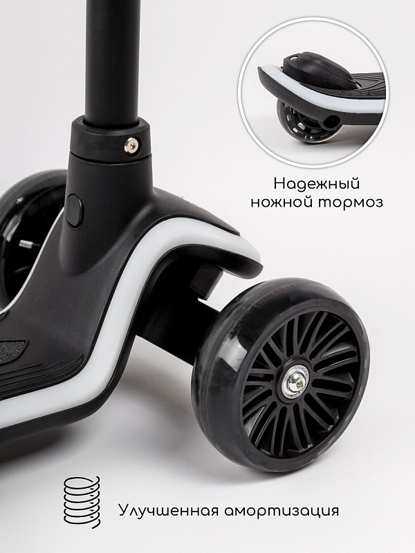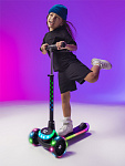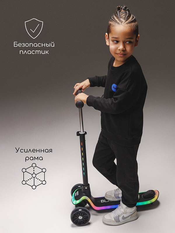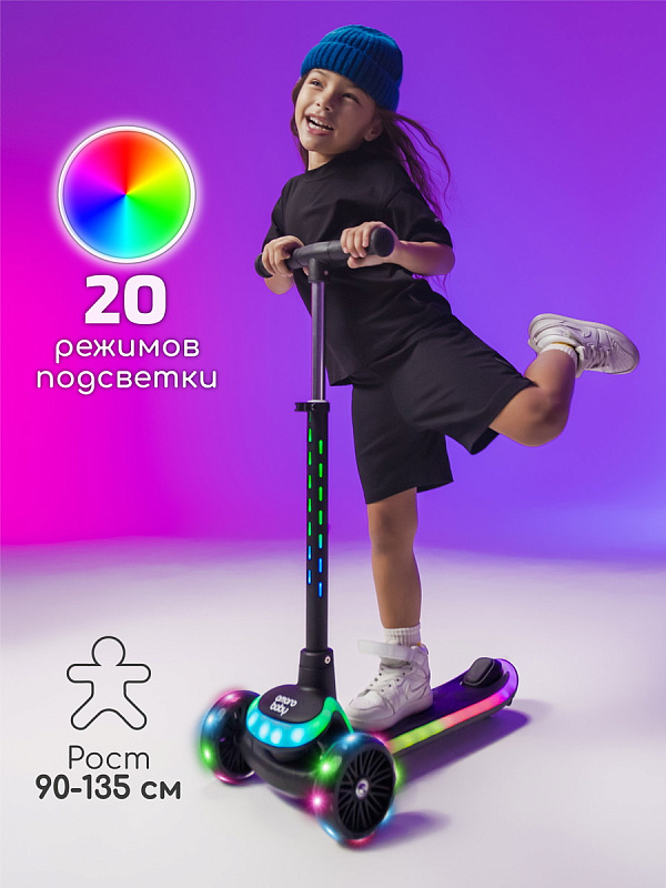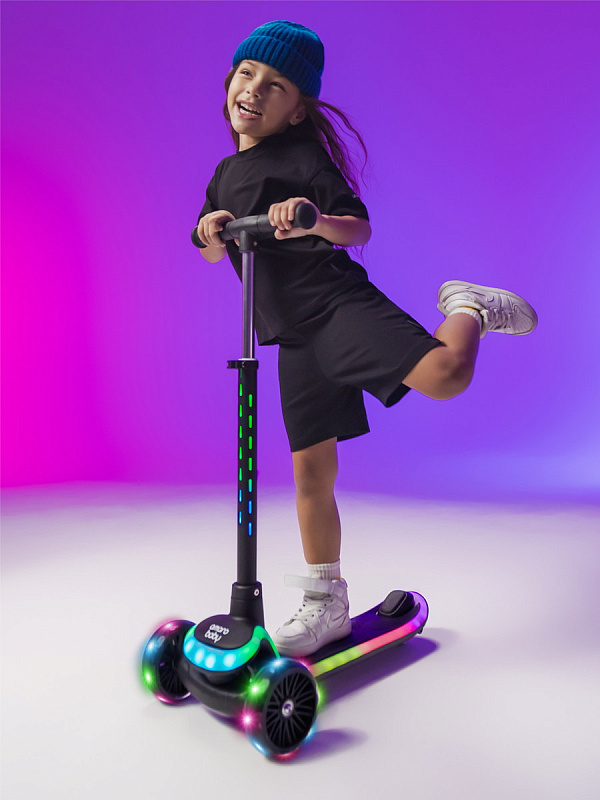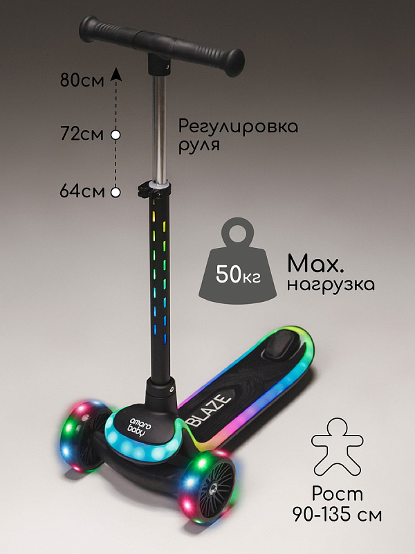 Светящийся трехколесный самокат AmaroBaby Blaze превратит обычную детскую прогулку в настоящий спектр позитивных эмоций! Детский трёхколёсный самокат подходит в качестве первого самоката для ребёнка. Кикборд изготовлен из качественных материалов и не имеет запаха. Выдерживает максимальную нагрузку 50 кг. Дека и рулевая стойка имеют встроенную подсветку из 20 режимов! Питание от трех батареек АА 1,5V (в комплект не входят). Переключаются режимы с помощью кнопки управления, расположенной на руле. Рулевая стойка наклоняется в нужную ребёнку сторону, что даёт возможность уверенно держаться в поворотах, сохранять равновесие. Высота руля регулируется по высоте от 64 до 80 см. Бесшумные полиуретановые колеса светятся во время езды. Диаметр передних колёс составляет 12 см, заднего 8 см. Торможение осуществляется с помощью ножного тормоза, который расположен на заднем колесе. Ребёнку будет удобно стоять на самокате благодаря комфортной длине деки 41 см, и ширине 13,5 см. На деке самоката предусмотрен специальный рельеф, чтобы ножка ребёнка не скользила. Подшипники ABEC-7 обеспечивает плавный ход самокату. Самокат отлично подойдёт в качестве подарка на День Рождения, Новый год, 8 марта. Порадуйте своего ребёнка стильным светящимся самокатом!