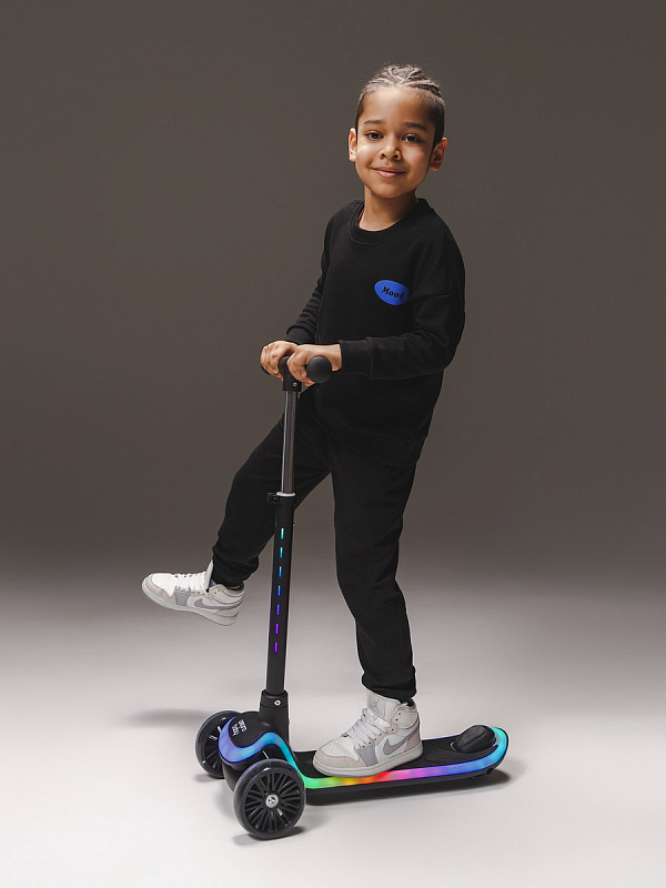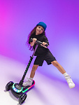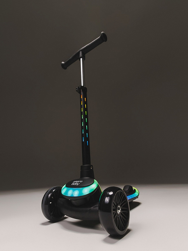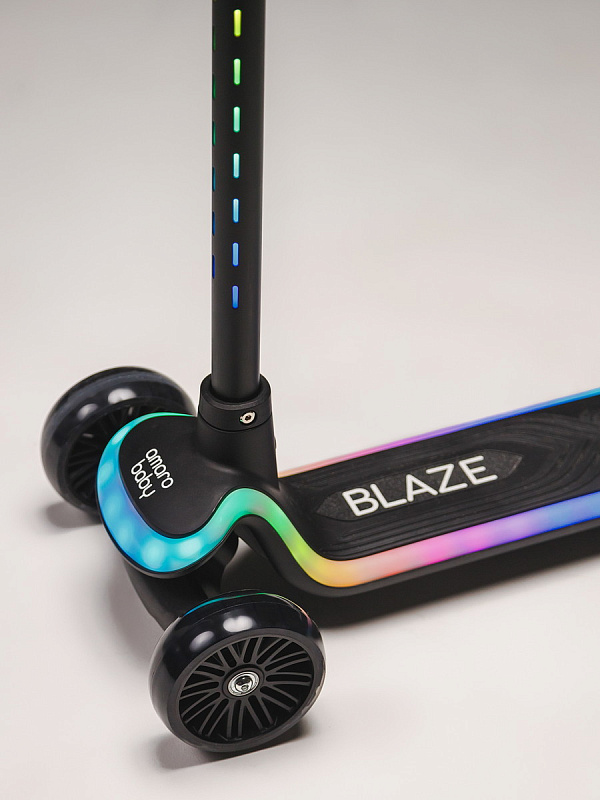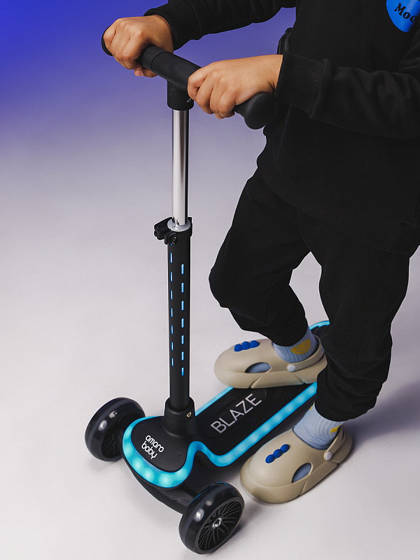 Светящийся трехколесный самокат AmaroBaby Blaze превратит обычную детскую прогулку в настоящий спектр позитивных эмоций! Детский трёхколёсный самокат подходит в качестве первого самоката для ребёнка. Кикборд изготовлен из качественных материалов и не имеет запаха. Выдерживает максимальную нагрузку 50 кг. Дека и рулевая стойка имеют встроенную подсветку из 20 режимов! Питание от трех батареек АА 1,5V (в комплект не входят). Переключаются режимы с помощью кнопки управления, расположенной на руле. Рулевая стойка наклоняется в нужную ребёнку сторону, что даёт возможность уверенно держаться в поворотах, сохранять равновесие. Высота руля регулируется по высоте от 64 до 80 см. Бесшумные полиуретановые колеса светятся во время езды. Диаметр передних колёс составляет 12 см, заднего 8 см. Торможение осуществляется с помощью ножного тормоза, который расположен на заднем колесе. Ребёнку будет удобно стоять на самокате благодаря комфортной длине деки 41 см, и ширине 13,5 см. На деке самоката предусмотрен специальный рельеф, чтобы ножка ребёнка не скользила. Подшипники ABEC-7 обеспечивает плавный ход самокату. Самокат отлично подойдёт в качестве подарка на День Рождения, Новый год, 8 марта. Порадуйте своего ребёнка стильным светящимся самокатом!