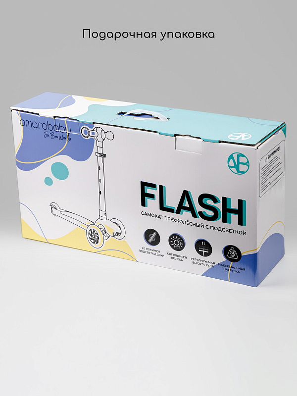 Трехколесный самокат AmaroBaby Flash отличный выбор для активных мальчиков и девочек! Детский самокат подходит в качестве первого самоката для ребёнка. Встроенная LED-подсветка деки (20 режимов) и светящиеся колеса сделают каждую прогулку незабываемой. Руль регулируется по высоте-подойдет для самых маленьких. На руле предусмотрен фонарик с тремя режимами. Безопасность на первом месте: нескользящая дека, устойчивая конструкция, наклон руля для уверенных поворотов. Плавный ход благодаря подшипникам ABEC-7. Самокат имеет малый вес 2,1 кг, чтобы даже маленьким детям было комфортно. Самокат для детей изготовлен из качественных материалов и не имеет запаха. Выдерживает максимальную нагрузку 50 кг. Бесшумные полиуретановые: диаметр передних колёс составляет 12 см, заднего 8 см.