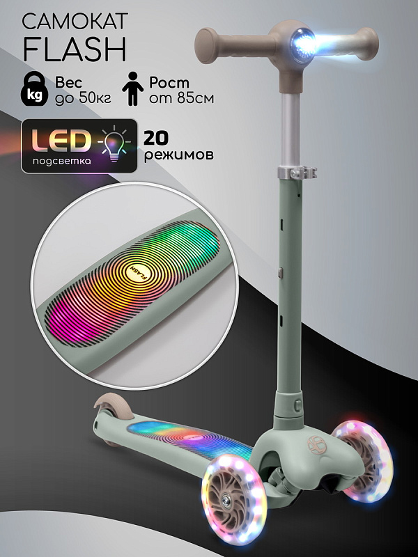 Самокат трехколёсный Amarobaby Flash с подсветкой зеленый