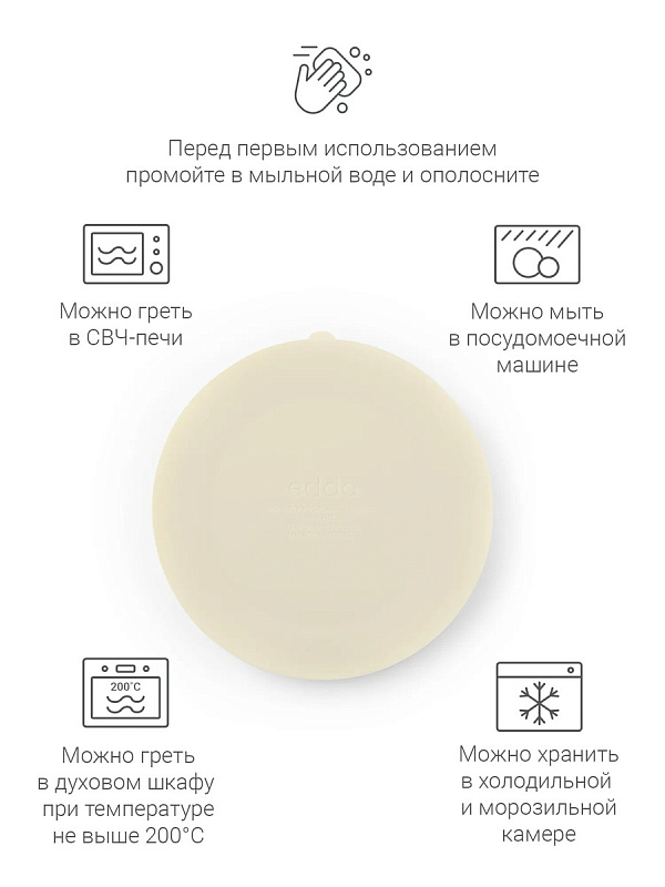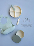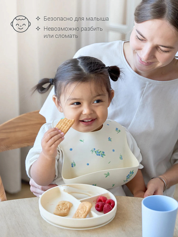 Материал тарелки — гипоаллергенный пищевой силикон. Её легко мыть, она ударопрочная и проста в уходе: её можно мыть в посудомоечной машине, она выдерживает высокие температуры и подходит для СВЧ-печи. Благодаря выверенной высоте бортиков продукты останутся в каждой секции и ребёнку не будет слишком высоко.