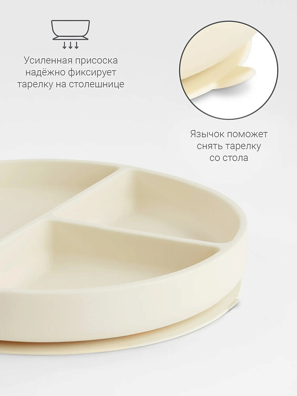 Важный плюс тарелки — крепкая присоска, которая спроектирована под углом, усиливающим сцепление со столом в несколько раз. Глянцевая присоска прочно фиксирует тарелку и не даёт ей перевернуться. Удобный язычок позволяет быстро открепить посуду от стола после приёма пищи.