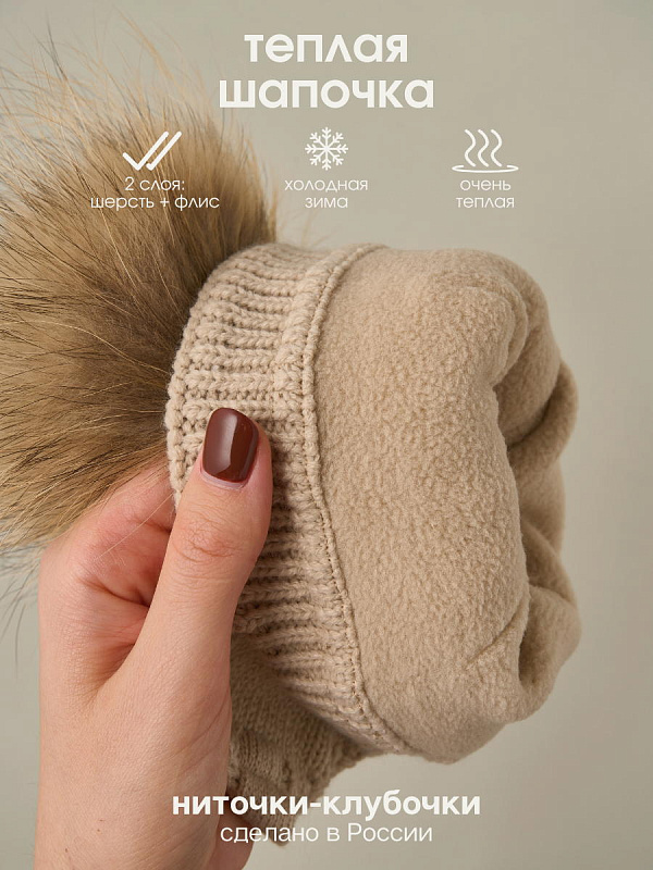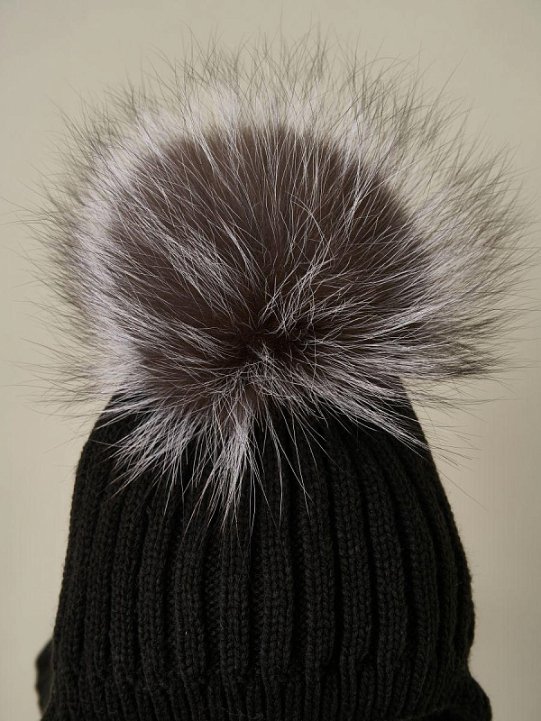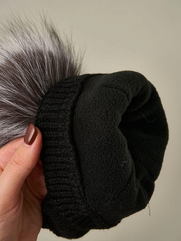 Зимняя шапочка с подкладой из флиса и натуральным бумбоном из меха енота.