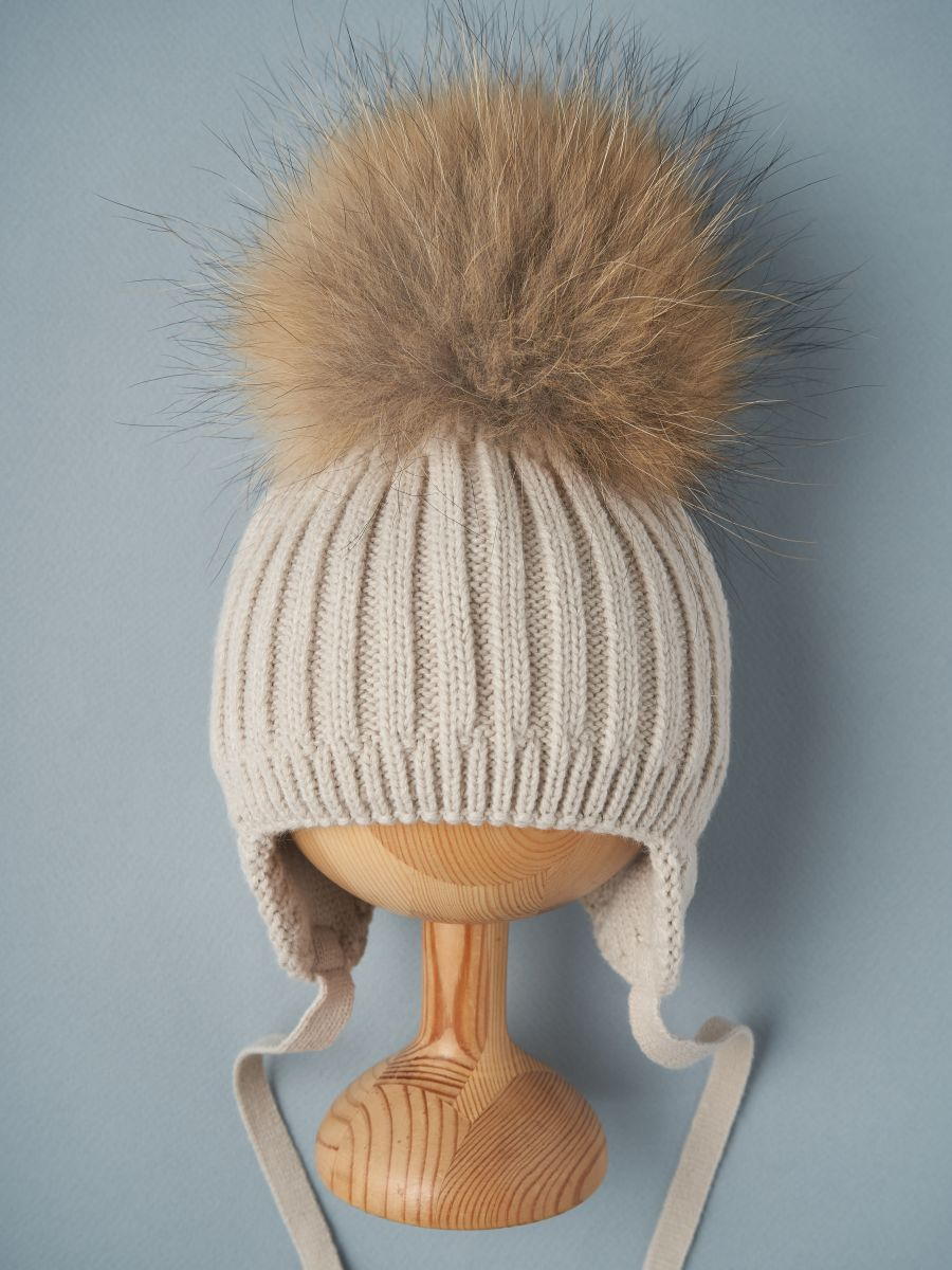 Зимняя шапочка с подкладой из флиса и натуральным бумбоном из меха енота.