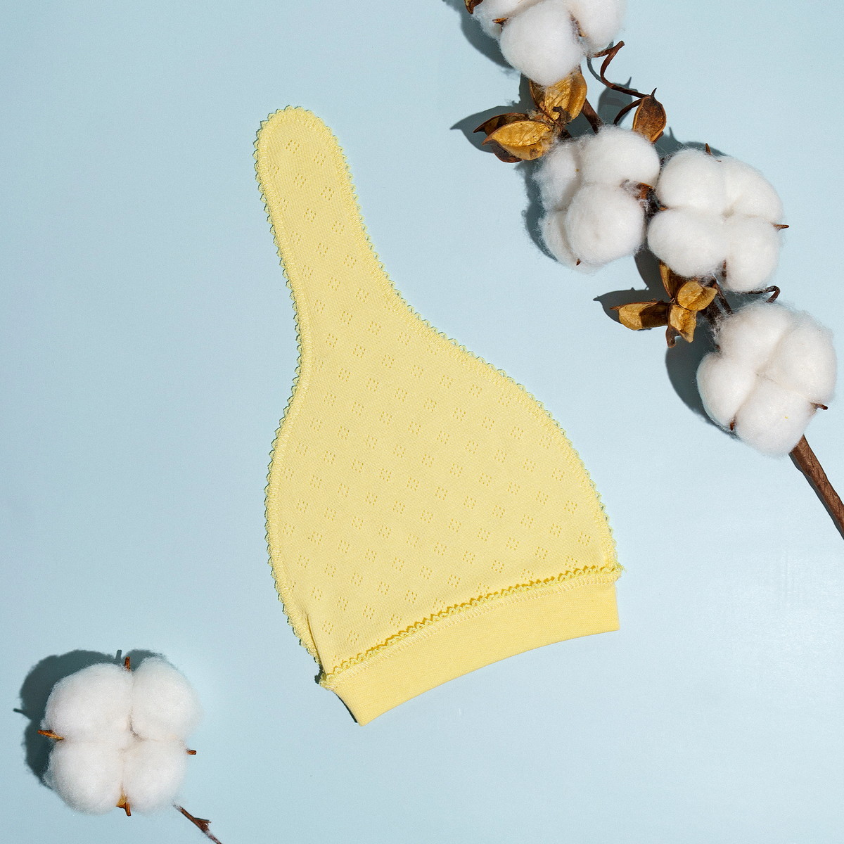Состав шапочки — 100% хлопок, что делает её мягкой и приятной на ощупь.