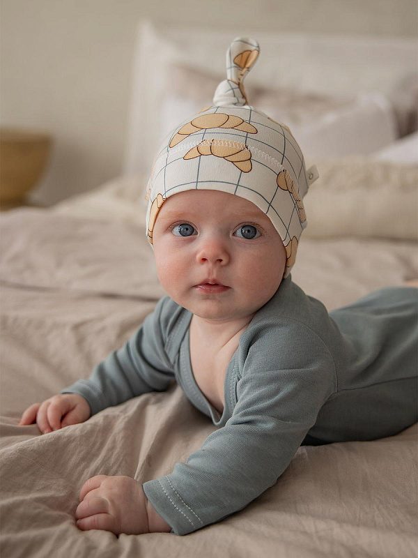 Шапочка с узелком mjölk [мьёльк] выполнена их трикотажного хлопка, который подходит нежной коже новорожденного, не вызывает аллергии и дарит малышу комфорт.