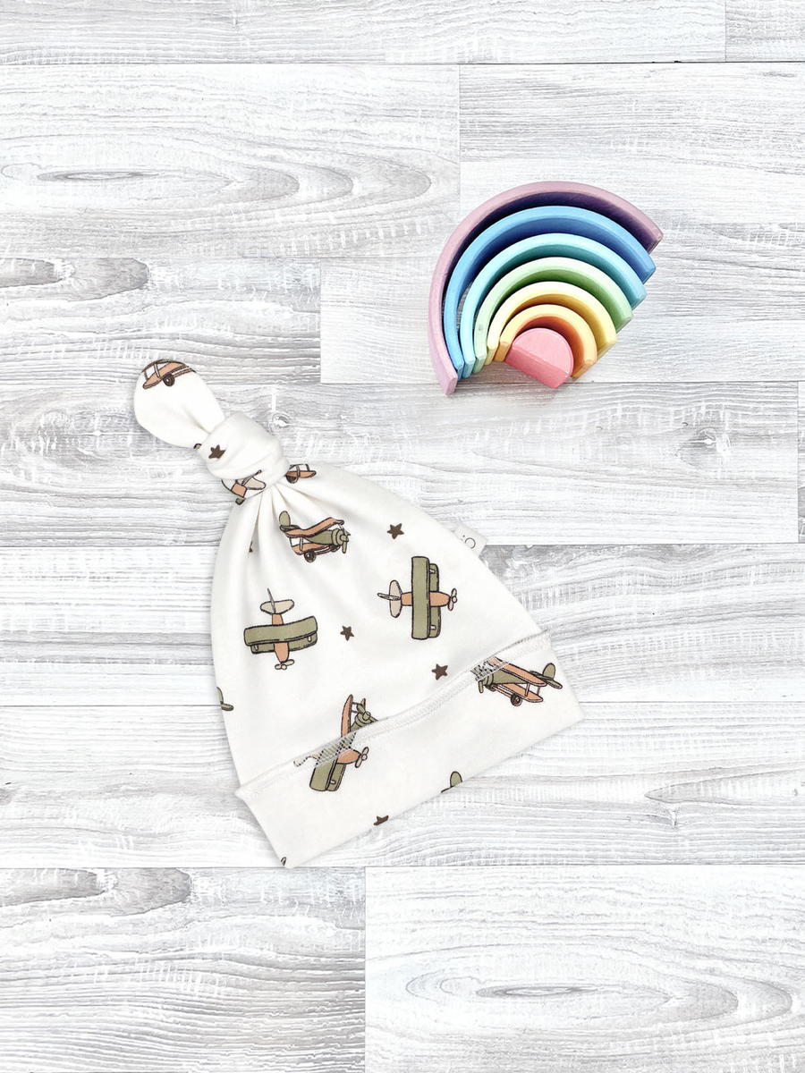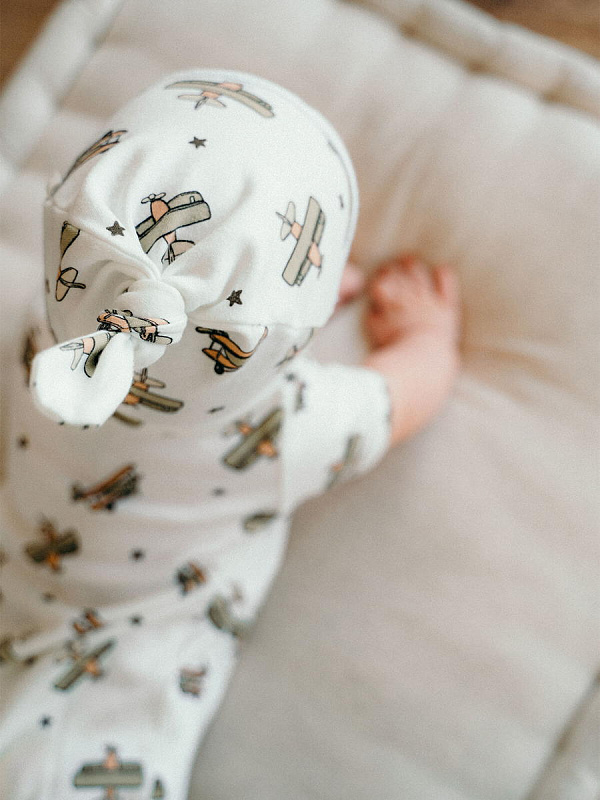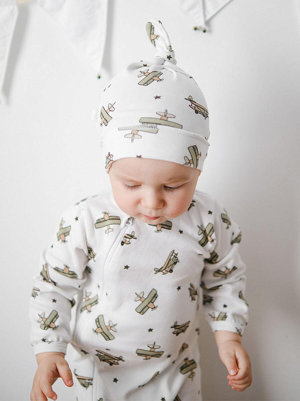 Шапочка с узелком Mjölk [мьёльк] Самолёты выполнена из нежного трикотажного 100% хлопка. Материал эластичный, не вызывает аллергии, дарит ребёнку уют и комфорт, а оригинальный принт придаёт малышу яркий и нарядный образ.