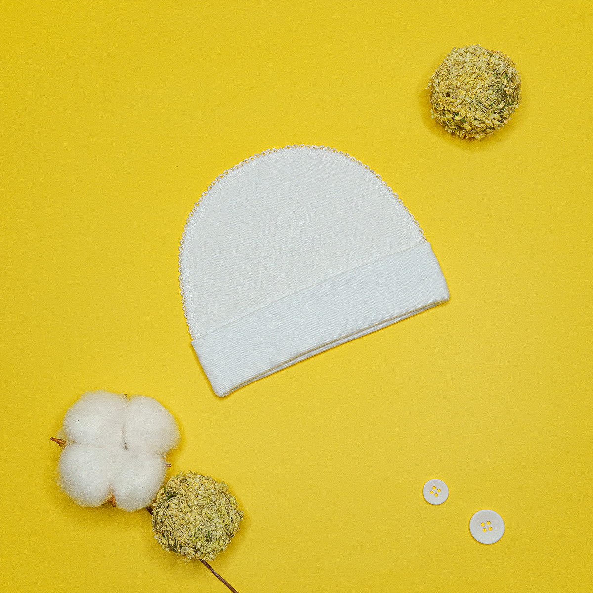 Шапочка выполнена из натуральной хлопковой ткани, которая хорошо пропускает воздух и немного тянется. Швы изделия выполнены с наружной части и не вызывают дискомфорта у ребенка.