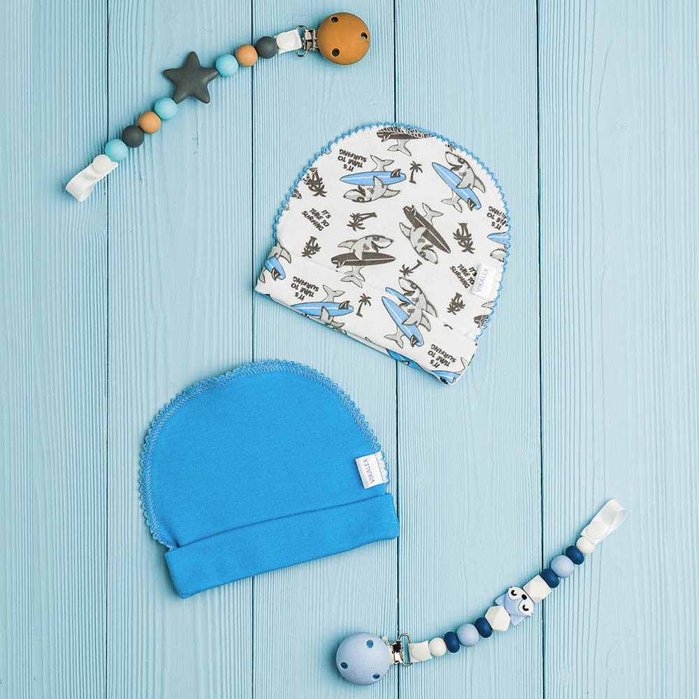 Комплект шапочек состоит их двух изделий. Модели выполнены из натуральной хлопковой ткани, которая хорошо пропускает воздух и немного тянется. Швы изделий выполнены с наружной части и не вызывают дискомфорта у ребенка.
