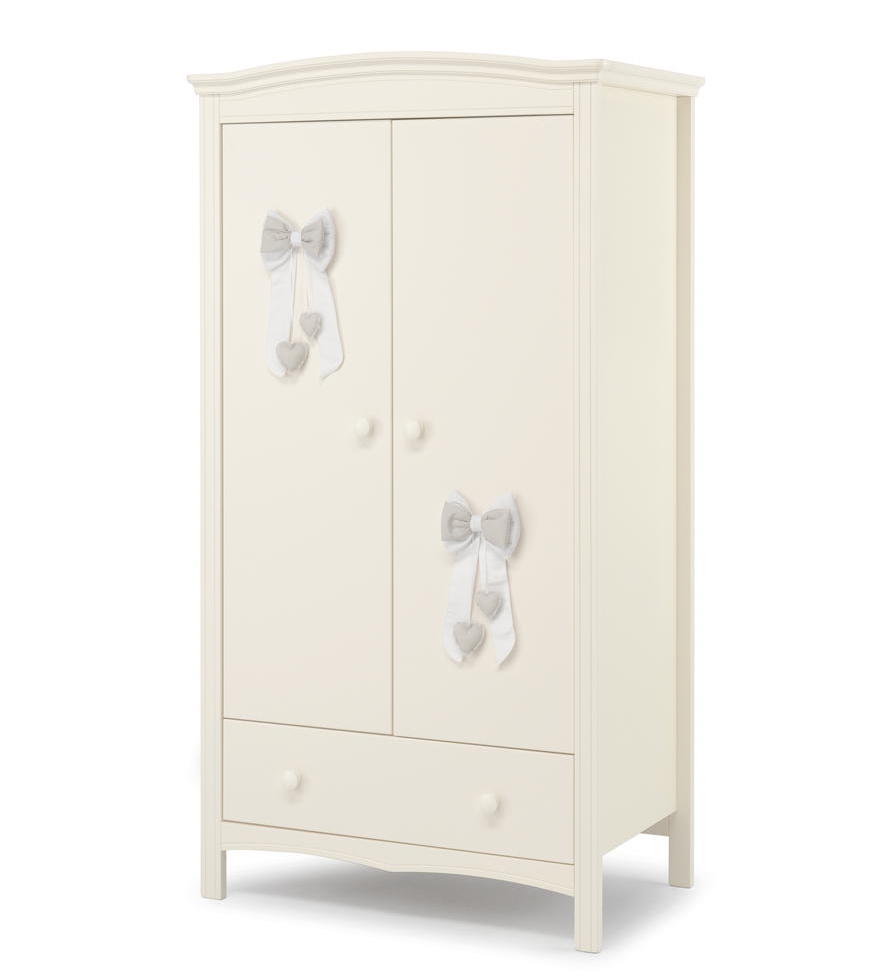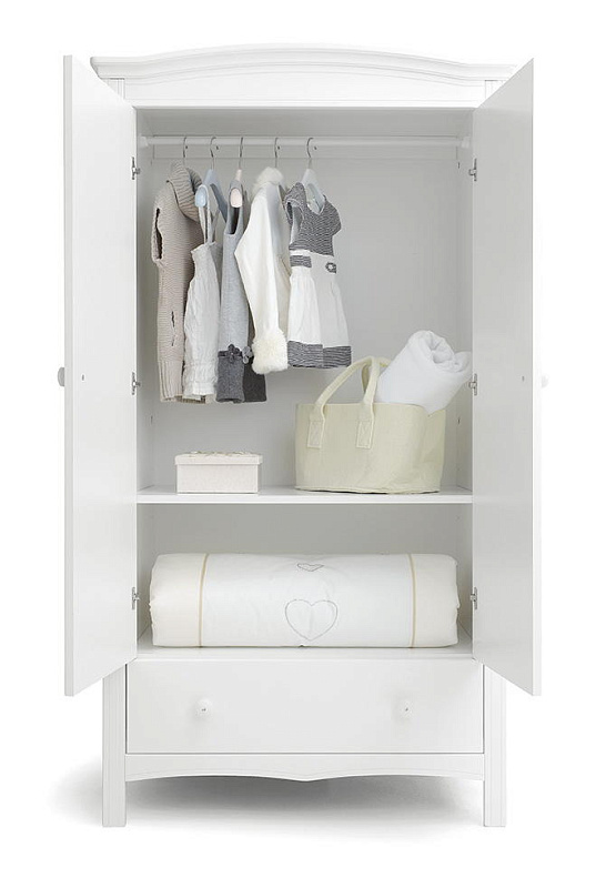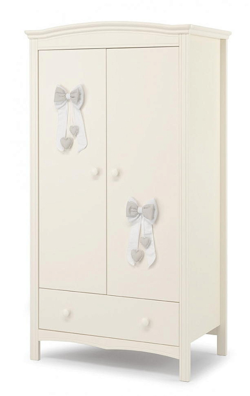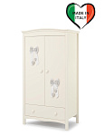 Шкаф Erbesi Lilli - это вместительный и широкий двухдверный шкаф из эксклюзивной итальянской коллекции детской мебели. Он имеет раму из массива бука с мелкой резьбой и панели из ДСП класса Е1 с низким содержанием формальдегида, покрытые материалом ПВХ. Внутри шкафа есть горизонтальная полка, которую можно регулировать по высоте, а также вешалка для одежды и глубокий внешний выдвижной ящик.