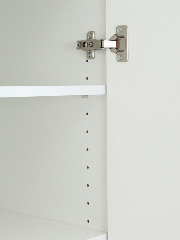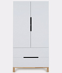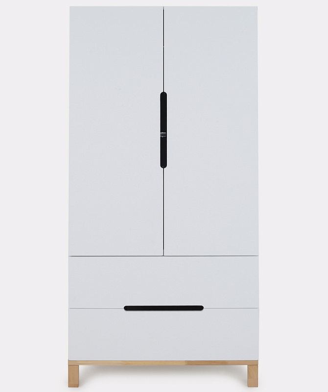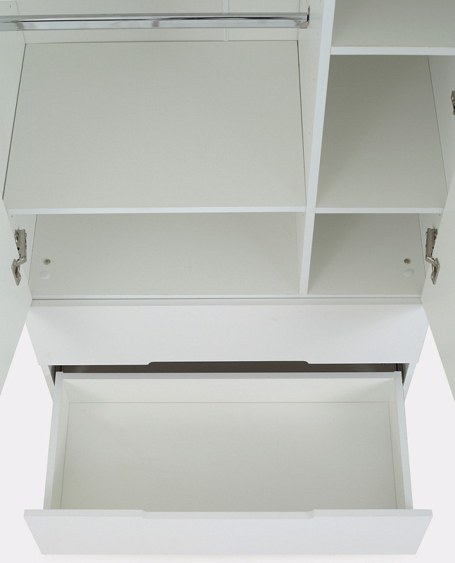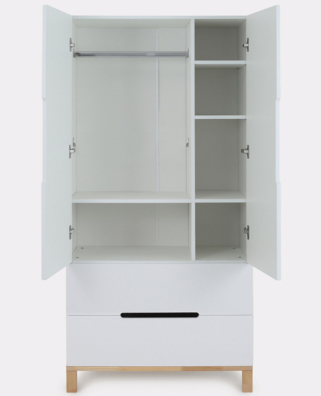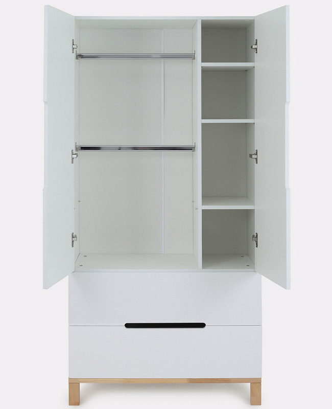 эргономичный шкаф включает в себя все, что понадобится для хранения вещей ребенка как в настоящее время, так и в будущем: объемное отделение с двумя штангами для плечиков и полочкой (все элементы съемные); четыре ряда полок; пара вместительных выдвижных ящиков