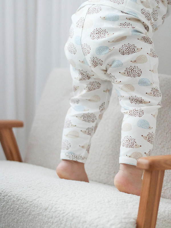 Штанишки Mjölk [мьёльк] Ёжики – классические трикотажные штанишки с открытой ножкой на всех размерах. Выполнены из нежного и плотного хлопка, не мешают малышу активно двигаться и не сковывают движений.