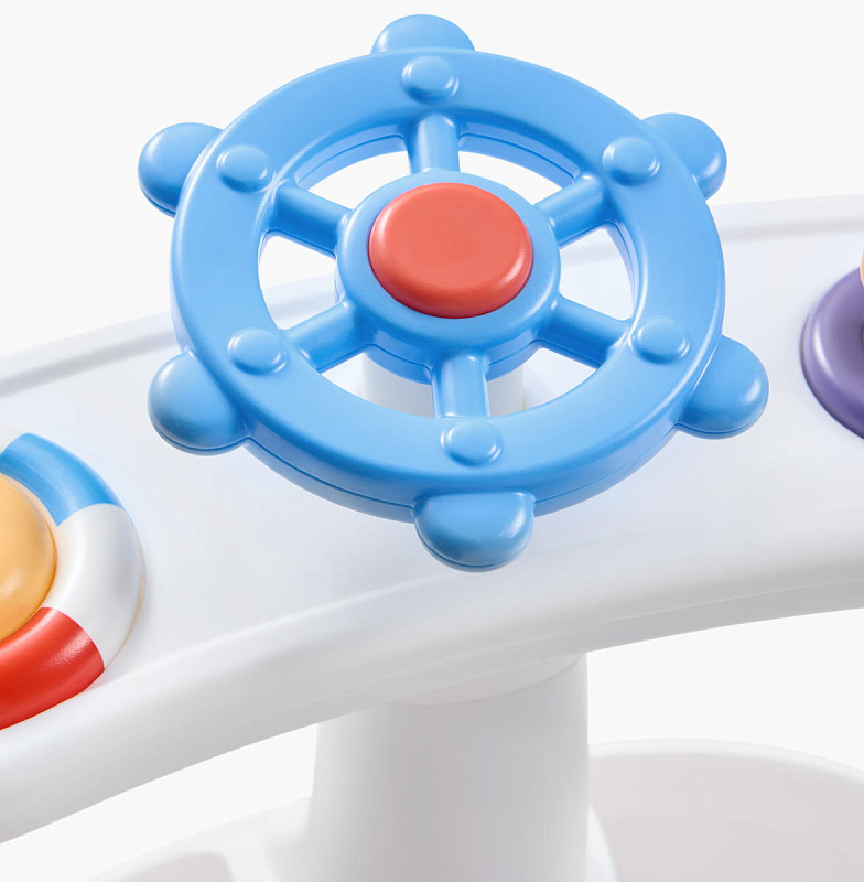 - Развитие и игра — руль, пищалка-уточка и спасательный круг стимулируют мелкую моторику и воображение ребенка