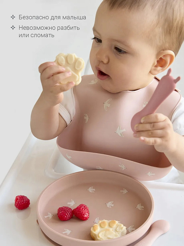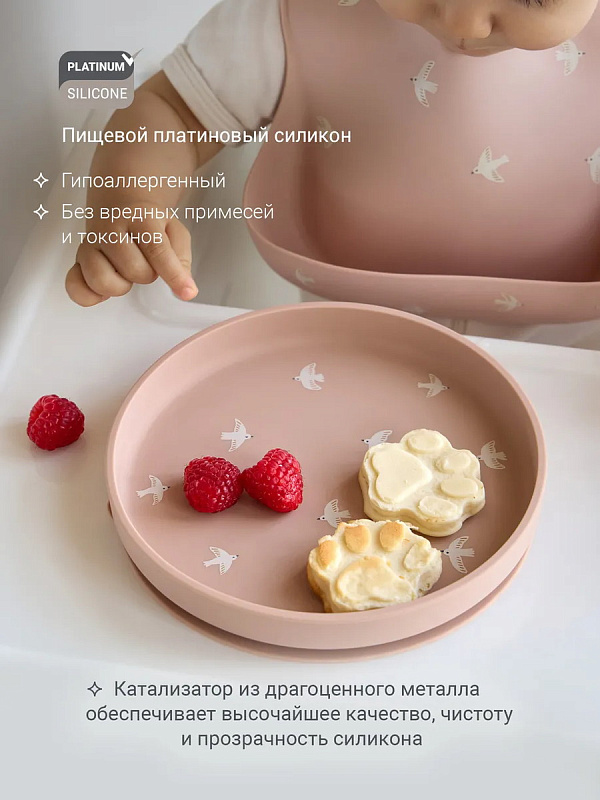 Тарелка выполнена из 100% гипоаллергенного платинового силикона — безопасного, и устойчивого к нагреванию материала без BPA. Продуманная присоска, усиленная за счёт специального угла, надёжно фиксирует тарелку на столе, а удобный язычок позволяет легко открепить её после еды. Выверенная высота бортиков удерживает еду внутри, поддерживая аккуратность и комфорт. Всё продумано до мелочей — чтобы забота ощущалась в каждом прикосновении.