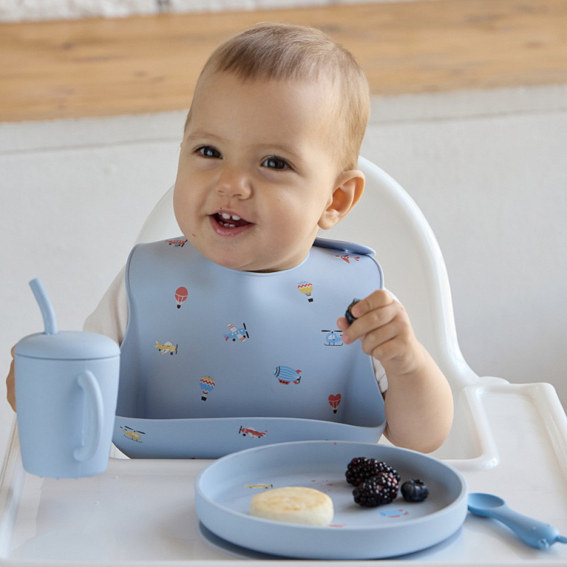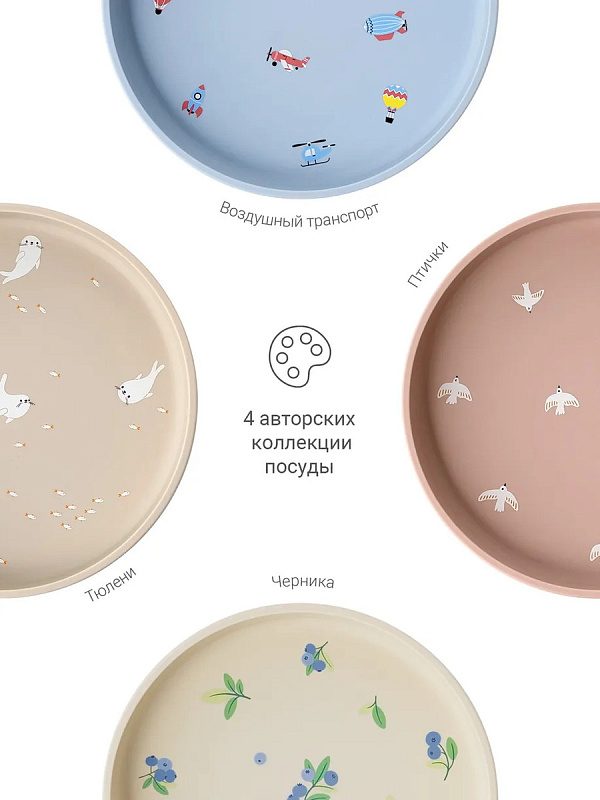 Тарелки представлены в четырех оттенках и принтах: Тюлень, Воздушный транспорт, Черника, Птички. Теперь можно собрать полноценную единую коллекцию посуды для малыша: поильник, тарелка, нагрудник и ложечки.