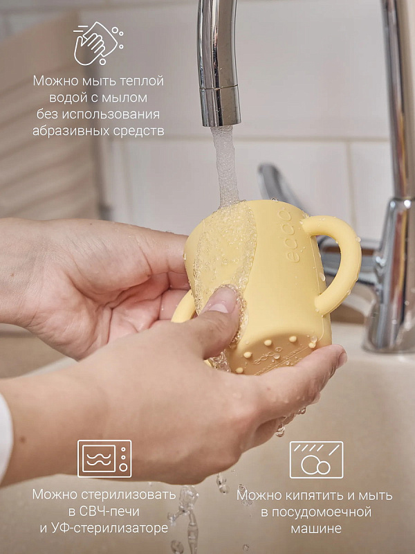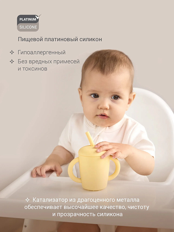 Поильник выполнен из безопасного гипоаллергенного материала — премиального 100% пищевого Platinum-силикона, изготовленного по европейским стандартам качества.