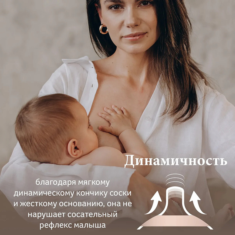 Динамичность - благодаря мягкому динамическому кончику соски и жесткому основанию не нарушает сосательный рефлекс.