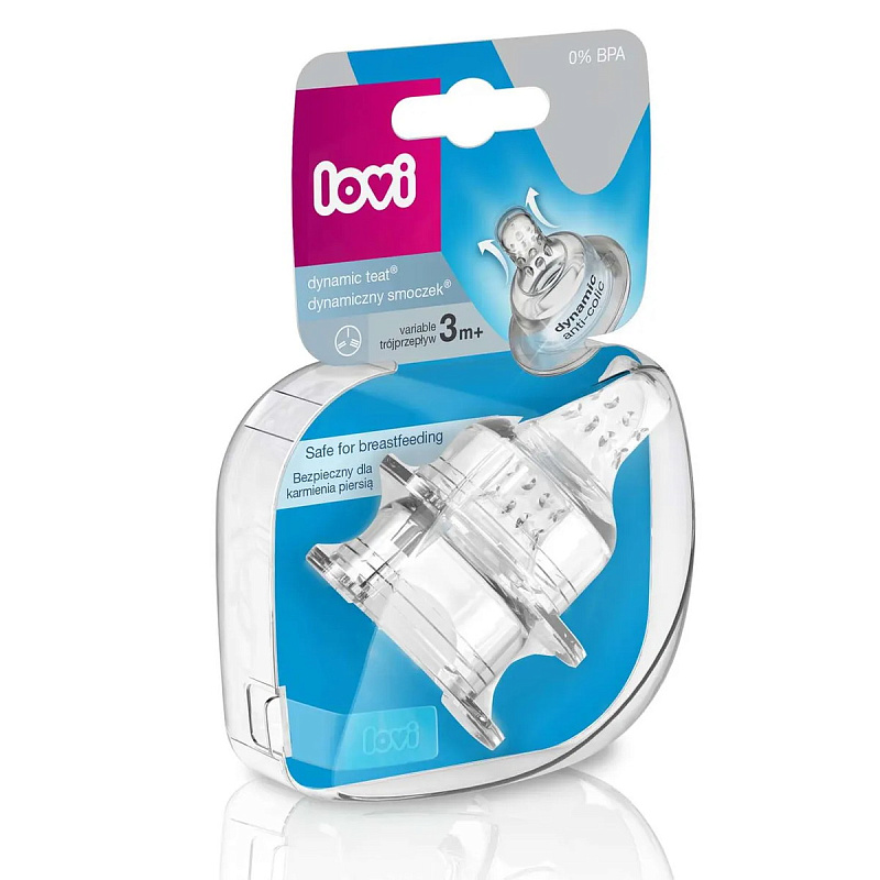 Данная модель соски позволяет менять скорость потока жидкости в зависимости от того, какая сторона соски соприкасается с языком ребенка. Динамическая соска LOVI очень похожа по тактильным ощущениям на сосок матери. Соска разработана по уникальной технологии неоднородных слоев силикона: имеет мягкий, тонкий растягивающийся кончик и твердое, широкое, профилированное основание. Благодаря чему не препятствует грудному вскармливанию и ребенок буквально мгновенно привыкает к ней и не испытывает стресса.