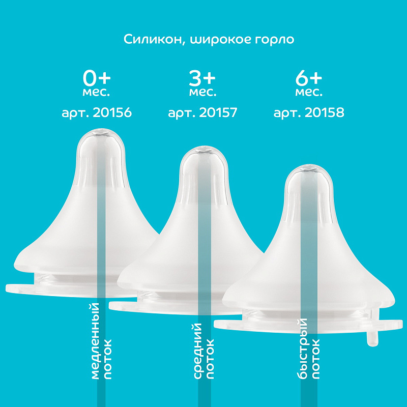 Силиконовая молочная соска для бутылочек с широким горлышком. Подходит для негустого и густого питания - молока и молочных смесей, сока, чая и воды, жидких каш и кисломолочных продуктов. Быстрый поток оптимален для детей от 6 месяцев. Изготовлена из двухкомпонентного пищевого силикона. Силиконовые соски упругие, что способствует развитию жевательного аппарата, не вызывают аллергию.