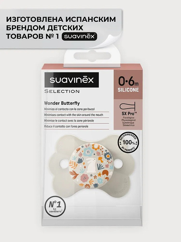 Детская ортодонтическая пустышка Suavinex WONDERLAND выполнена из ультрамягкого силикона с пескоструйной обработкой и имеет плоскую симметричную соску SX Pro, которая анатомически правильно располагается во рту ребенка, не препятствуя естественному развитию ротовой полости и прикуса.