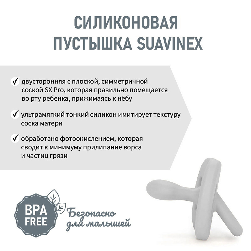 Детская ортодонтическая пустышка Suavinex COLOUR ESSENCE выполнена из ультрамягкого силикона с пескоструйной обработкой, к котрому не налипает пыль и ворс. Плоская симметричная соска анатомически правильно располагается во рту ребенка, не оказывая давления на нёбо и не препятствуя естественному развитию ротовой полости и прикуса.