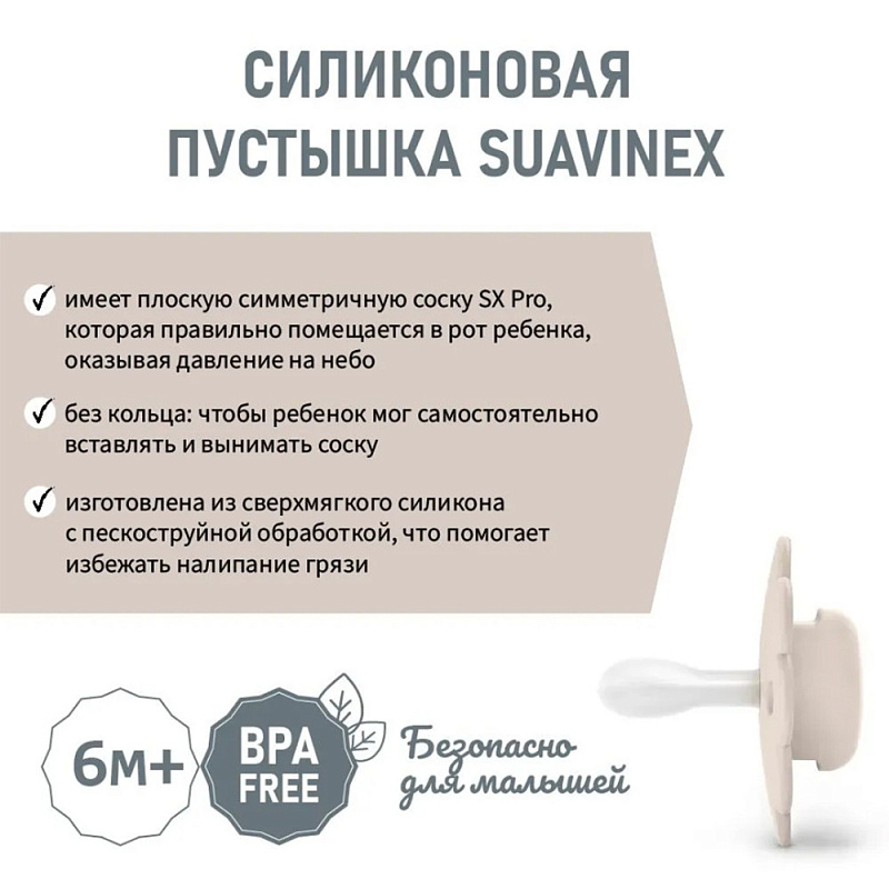Детская ортодонтическая пустышка Suavinex WONDER выполнена из ультрамягкого силикона с пескоструйной обработкой и имеет плоскую симметричную соску SX Pro, которая анатомически правильно располагается во рту ребенка, не препятствуя естественному развитию ротовой полости и прикуса.
