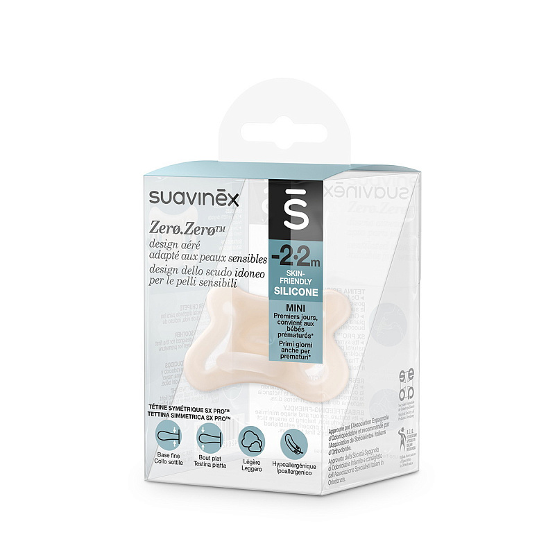 Физиологическая пустышка Suavinex из серии ZERO.ZERO рекомендована для недоношенных малышей, рожденных на сроке от 30-ти недель, а также малышей с небольшим весом и слабым сосательным рефлексом. За счет своей формы и материала пустышка ZERO.ZERO S -2/2 позволяет как можно ближе передать ощущение естественного сосательного рефлекса и проще адаптироваться в новых условиях.