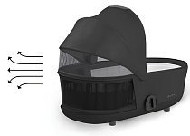 Люлька оснащена регулируемым солнцезащитным капором, который обеспечивает защиту от солнца на уровне UPF50+, и у которого имеется выдвижной козырёк, обеспечивающий дополнительную тень. Регулируемый капор с большим козырьком защищает ребёнка от солнца и ветра во время прогулки. У люльки имеется удобная ручка для переноса. Накидка для люльки надежно защищает малыша в ветреную и снежную погоду.