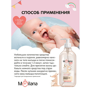 Способ применения: Небольшое количество средства вспеньте в ладонях, равномерно нанесите на тело малыша и легко помассируйте в течение 1-2 минут, затем тщательно смойте. Для принятия ванны добавьте немного геля под струю воды. После купания аккуратно промокните кожу малыша полотенцем. Подходит для ежедневного применения