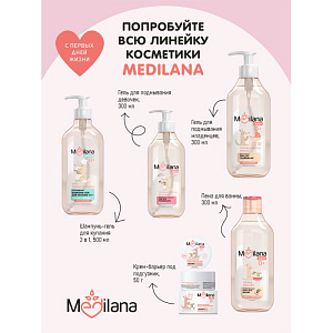 Средство для купания Medilana baby бережно очищает кожу, идеально подходит для ежедневных водных процедур. Смягчает воздействие жесткой воды на кожу малыша и минимизирует проявление сухости, шелушений, поддерживает естественный рН-баланс. Средство способствует укреплению кожного барьера, препятствующего потере влаги.