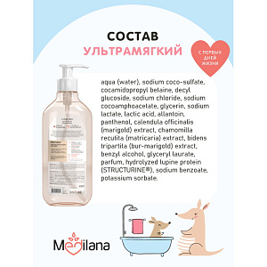 Состав: aqua (water), sodium coco-sulfate, cocamidopropyl betaine, decyl glucoside, sodium chloride, sodium cocoamphoacetate, glycerin, sodium lactate, lactic acid, allantoin, panthenol, calendula officinalis (marigold) extract, chamomilla recutita (matricaria) extract, bidens tripartita (bur-marigold) extract, benzyl alcohol, glyceryl laurate, parfum, hydrolyzed lupine protein (STRUCTURINE ®), sodium benzoate, potassium sorbate.