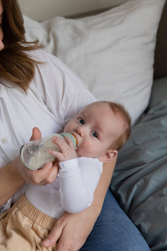 Бутылочка выполнена в скандинавском ретро-дизайне. Соска круглой естественной формы с медленным потоком изготовлена из натурального каучука (из сока дерева гевеи).